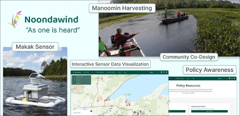Noondawind is a community data sharing platform designed to support environmental stewardship and data sovereignty for Ojibwe communities in the Great Lakes region. Co-created through long-term partnerships, this project aims to integrate Ojibwe Knowledge with environmental sensing data, community resources, and relevant policy information to support a community-centered platform to drive action. Rather than treating data as neutral or extractive, Noondawind foregrounds relational accountability—ensuring that environmental monitoring, visualization, and data sharing tools reflect partner Nation priorities, cultural values, and intergenerational responsibilities, particularly around the protection of Manoomin (wild rice) and freshwater ecosystems.