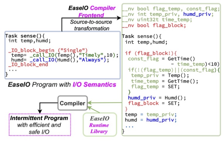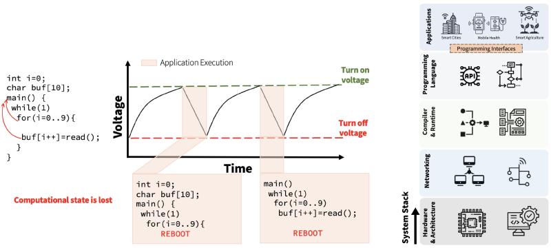 Intermittent computing fundamentally breaks the traditional assumption of continuous power, making conventional programming models unsafe and error-prone. Programming languages and runtimes for intermittent systems provide structured execution models—such as task boundaries, transactional memory semantics, and safe checkpointing—that guarantee forward progress and memory consistency across power failures. By elevating energy failure to a first-class abstraction, these language-level tools make battery-free and energy-harvesting systems practical, reliable, and accessible to developers. Some examples from our lab include: